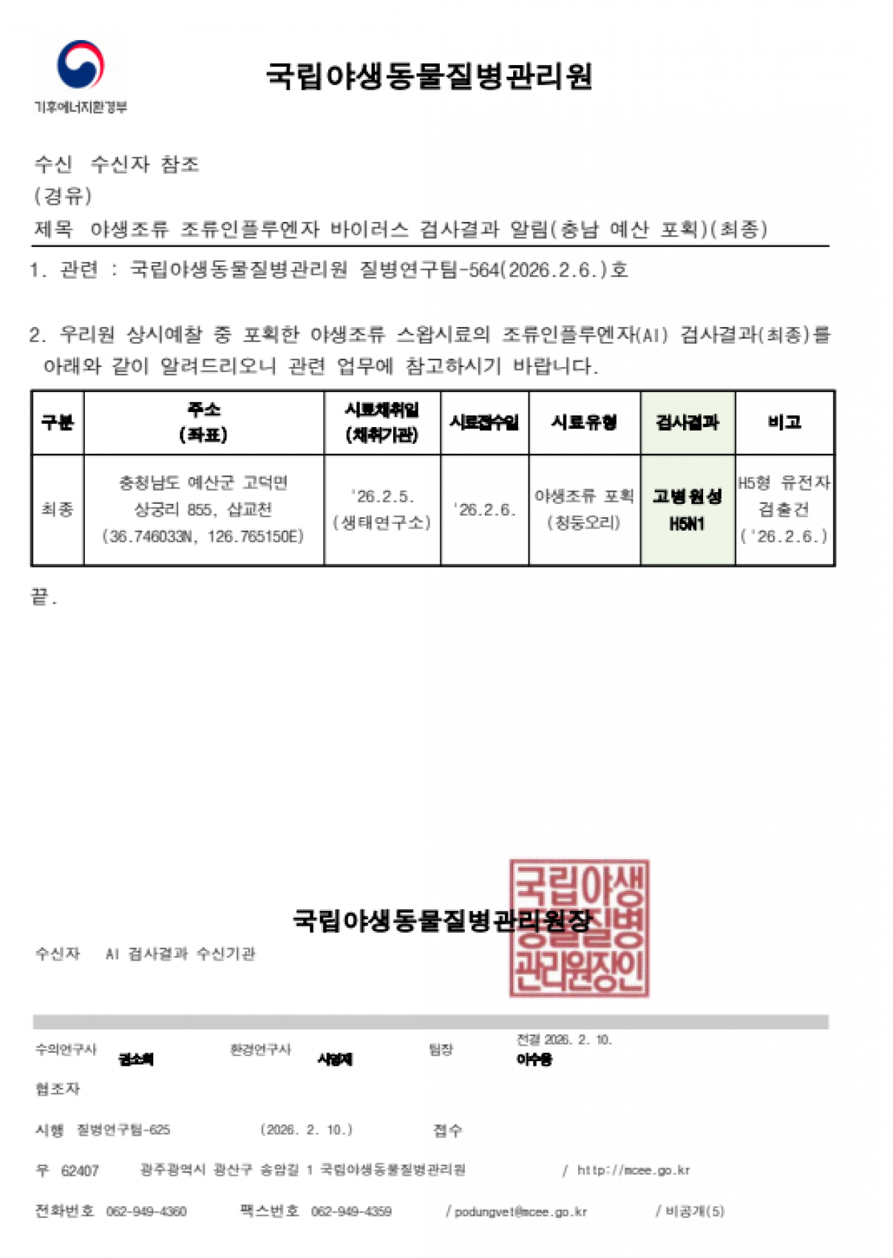 야생조류 고병원성 조류인플루엔자(H5N1형) 검출에 따른 차단방역 강화 알림