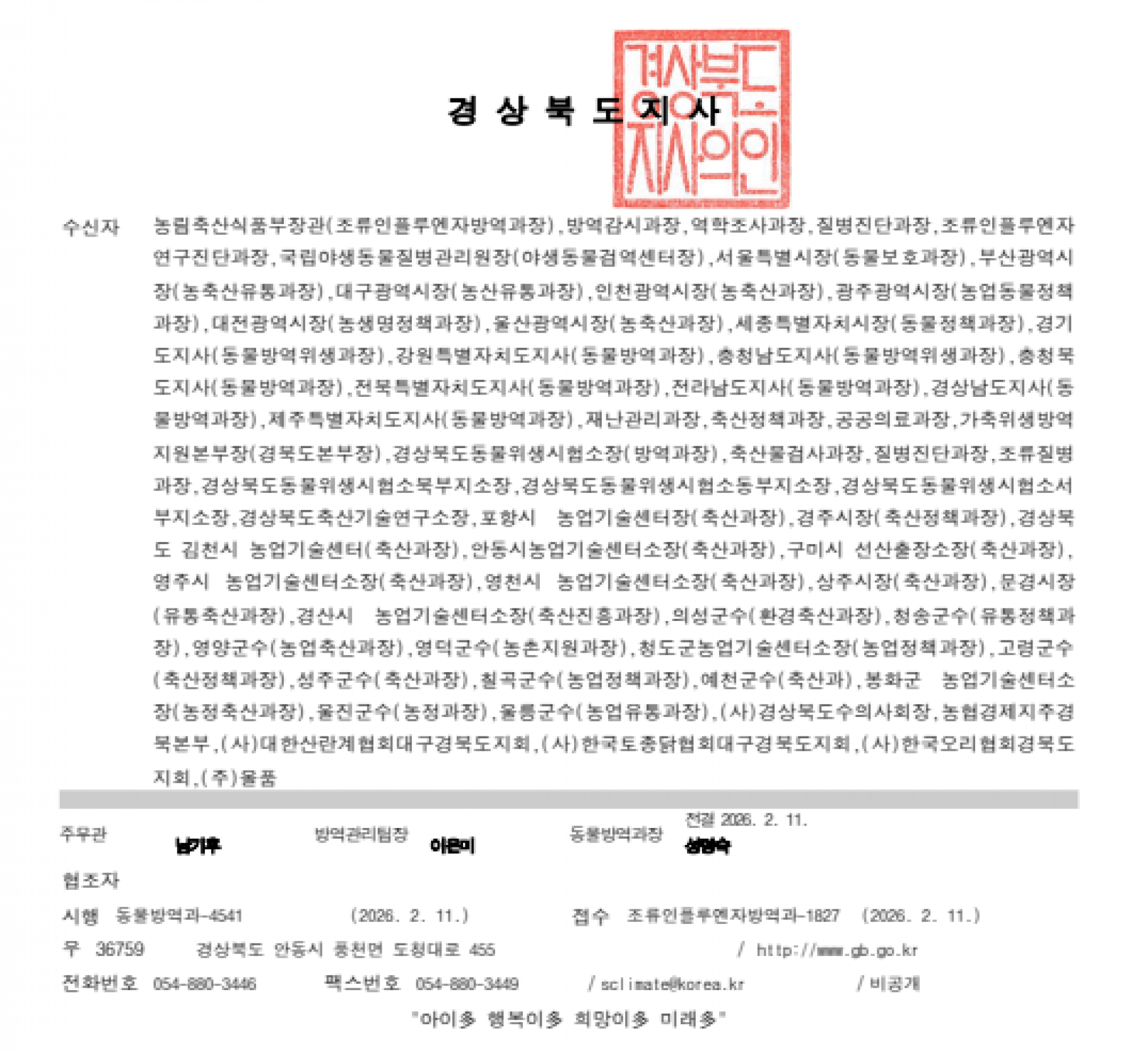 경북 성주 가금농장(육용오리) 고병원성 AI 의사환축 발생에 따른 방역강화 조치