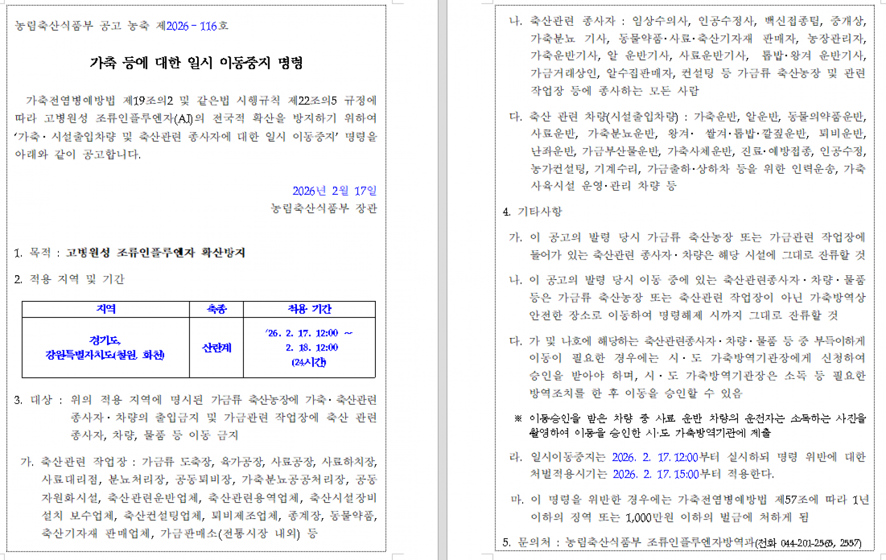 가축(산란계) 등에 대한 일시 이동중지(Standstill) 명령 발령 알림