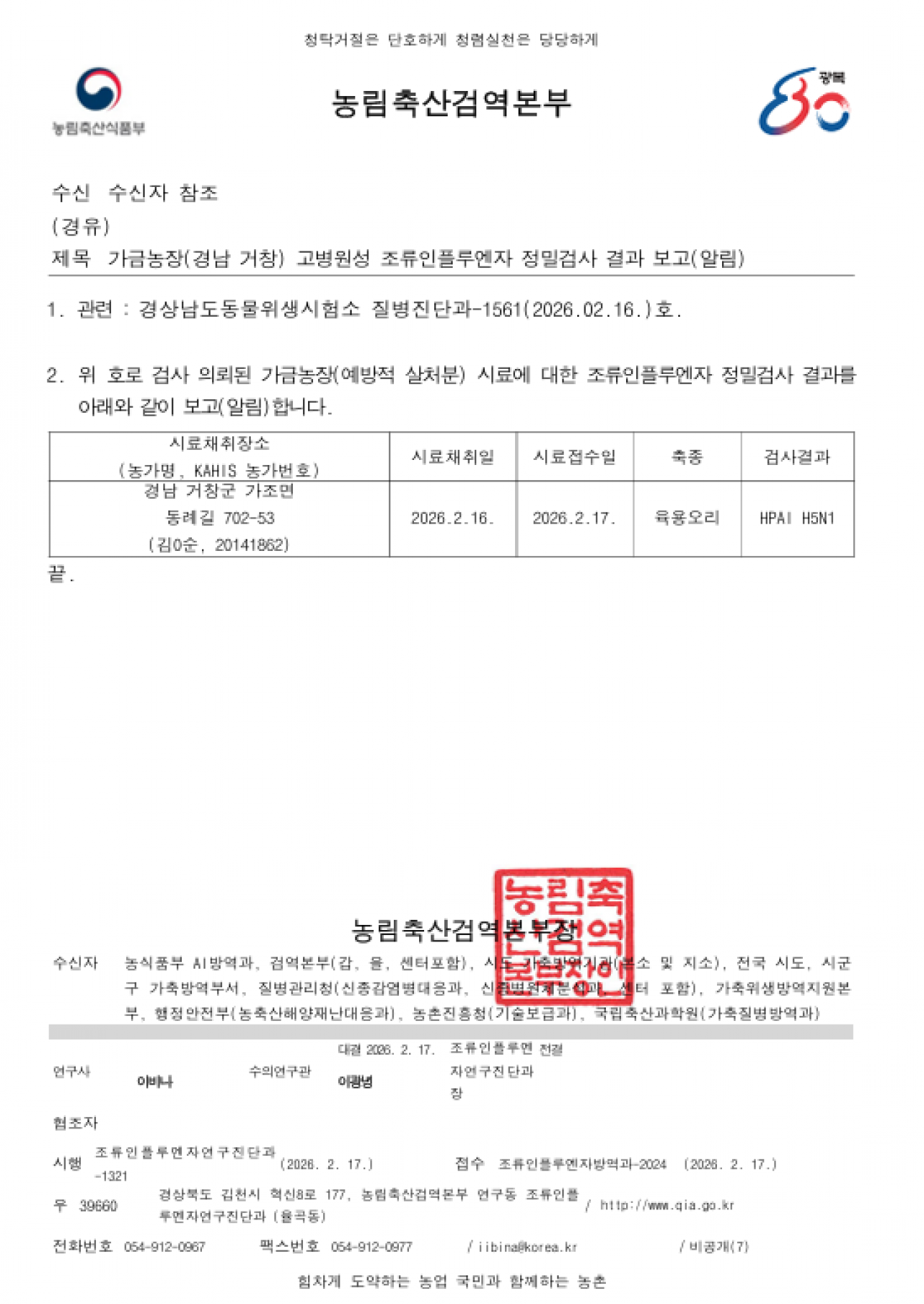 경남 거창 예방적 살처분 가금농장(육용오리) 고병원성 조류인플루엔자(AI) 확진에 따른 방역조치 알림