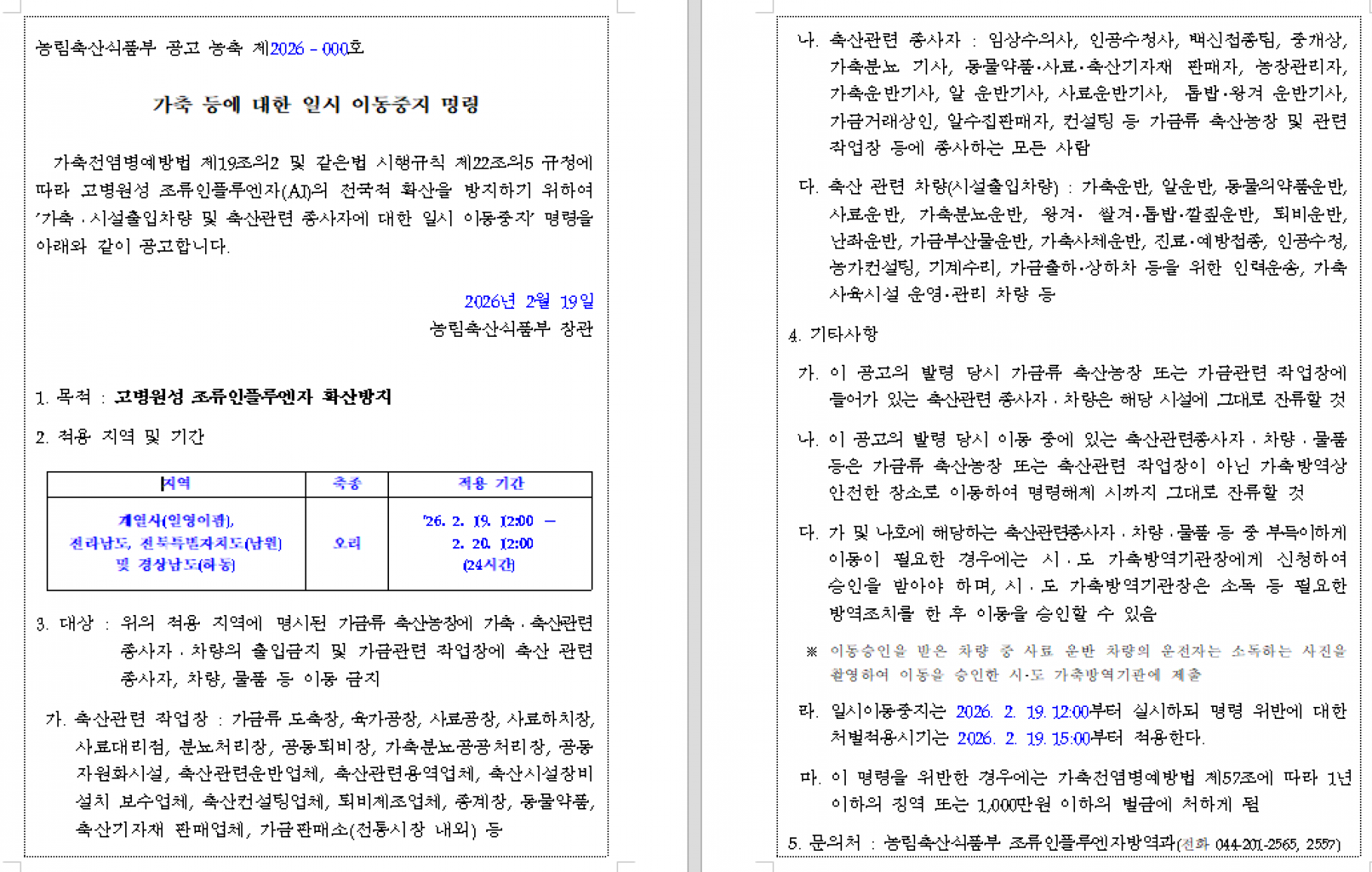 가축(오리) 등에 대한 일시 이동중지(Standstill) 명령 발령 알림