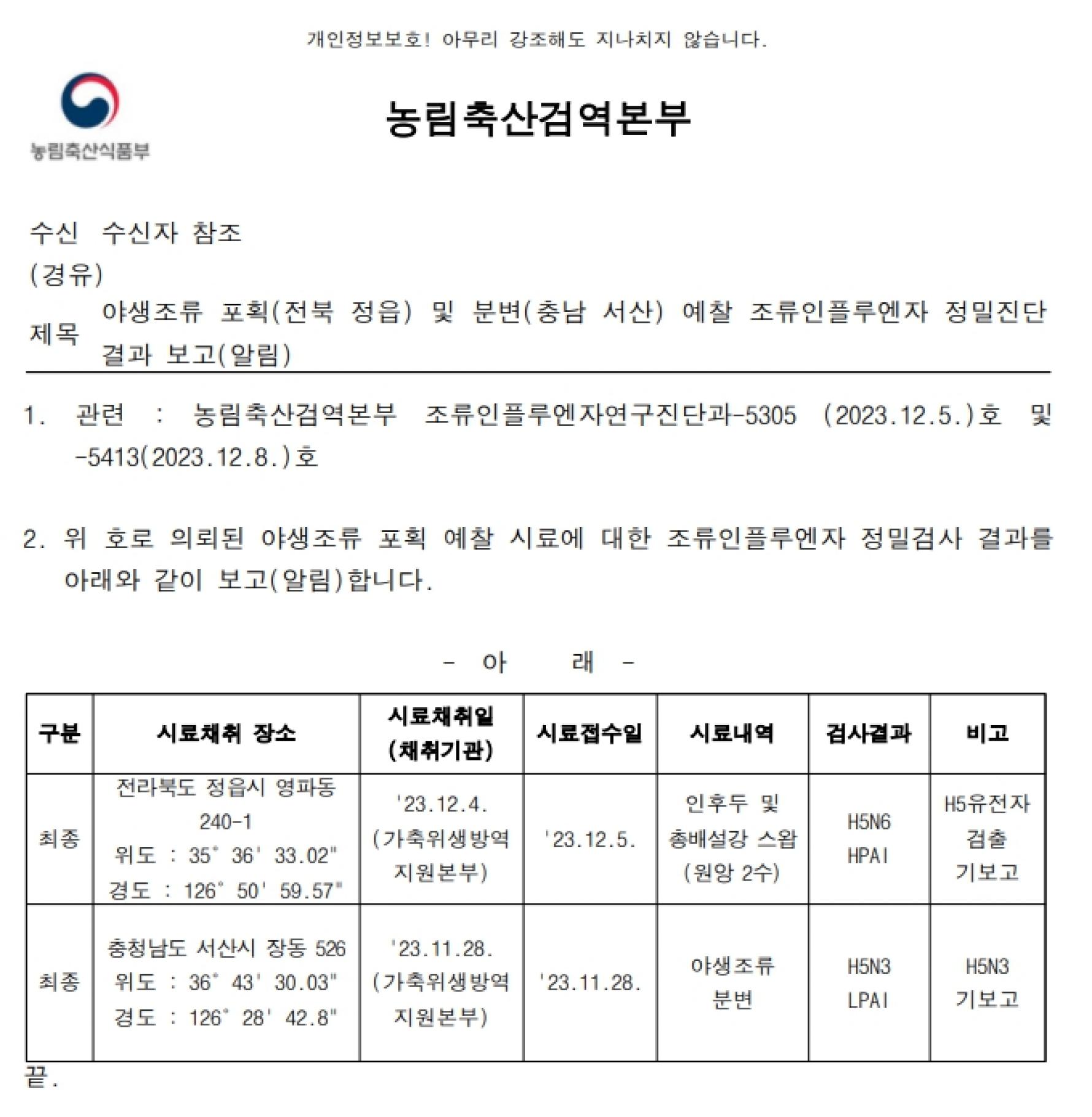 (전북 정읍)야생조류 H5형 조류인플루엔자(AI) 항원 검출에 따른 차단방역 및 예찰 강화 알림