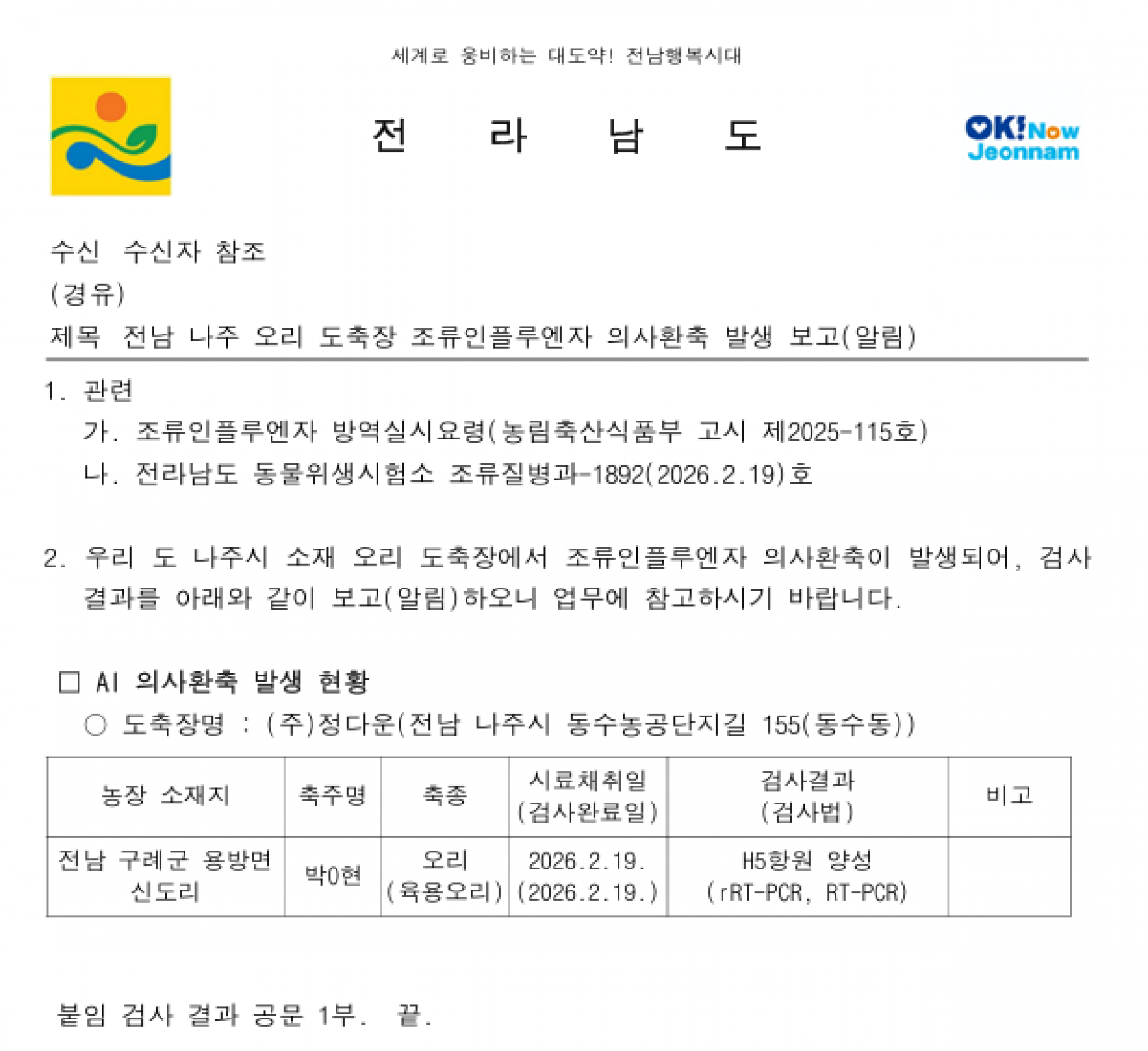 전남 나주 도축장 고병원성 AI 의사환축(육용오리) 확인에 따른 방역강화 조치