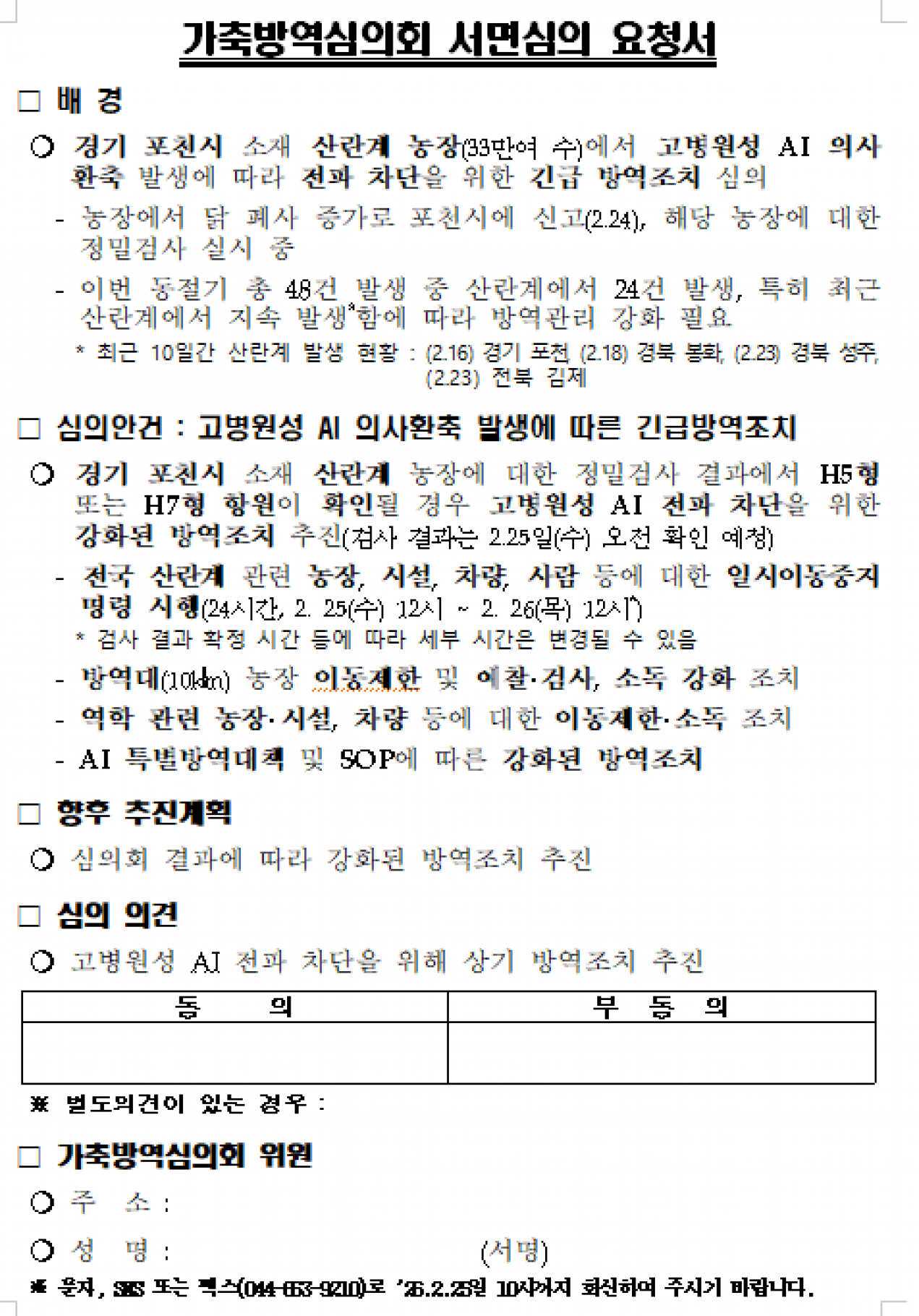 가축방역심의회(가금질병분과위) 서면심의 요청