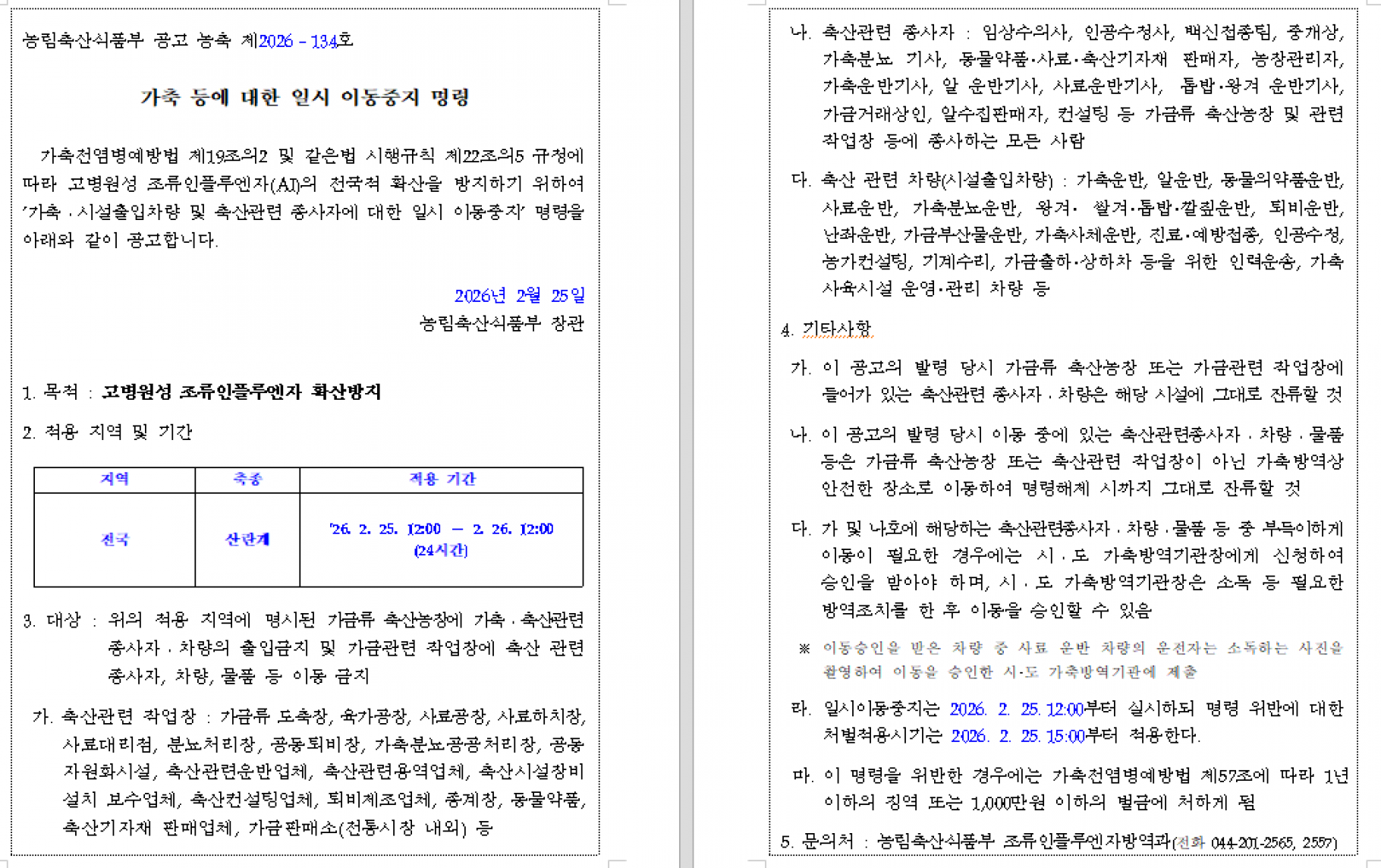 가축(산란계) 등에 대한 일시 이동중지(Standstill) 명령 발령 알림