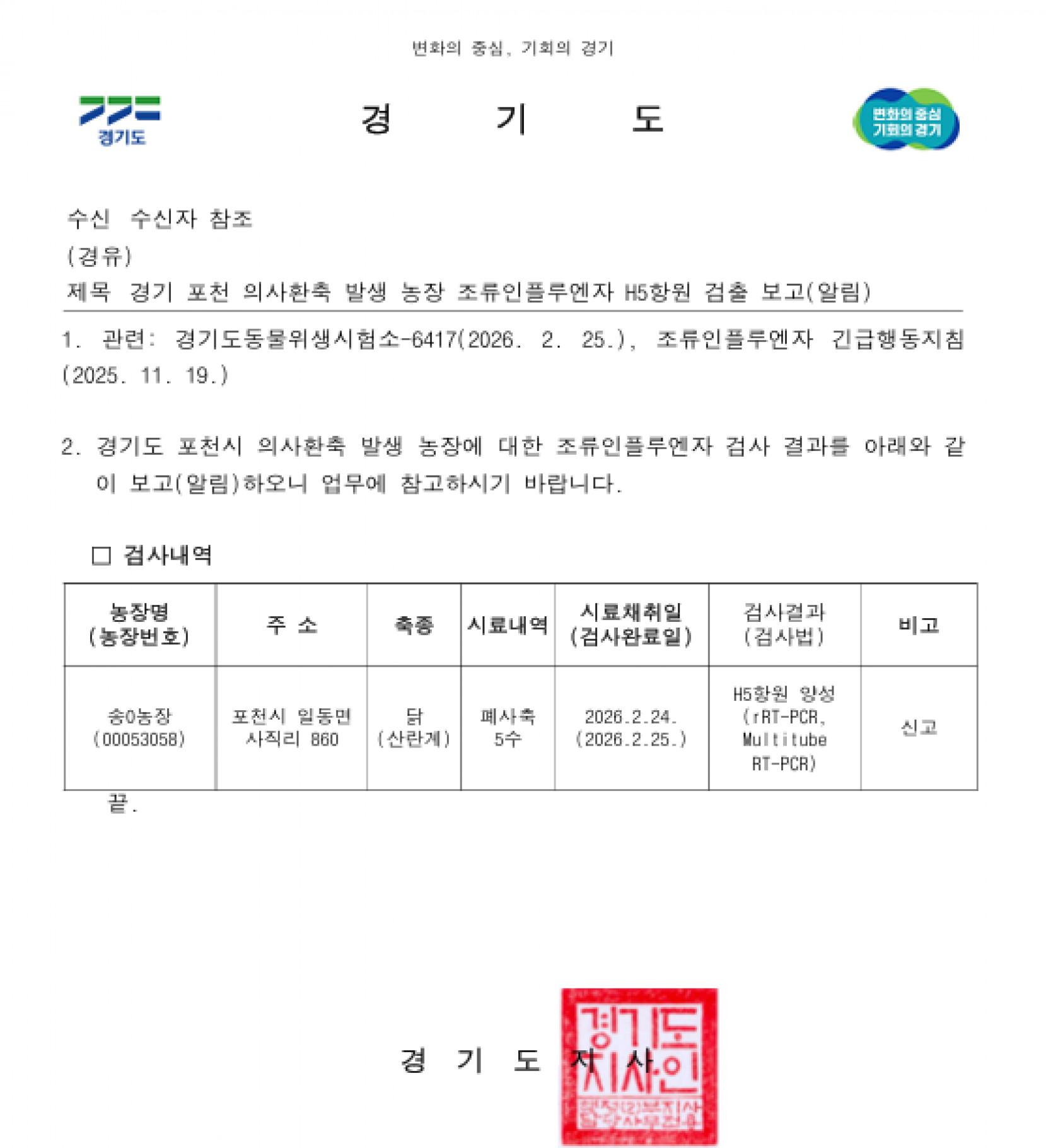 경기 포천 가금농장(산란계) 고병원성 AI 의사환축 발생에 따른 방역강화 조치 |