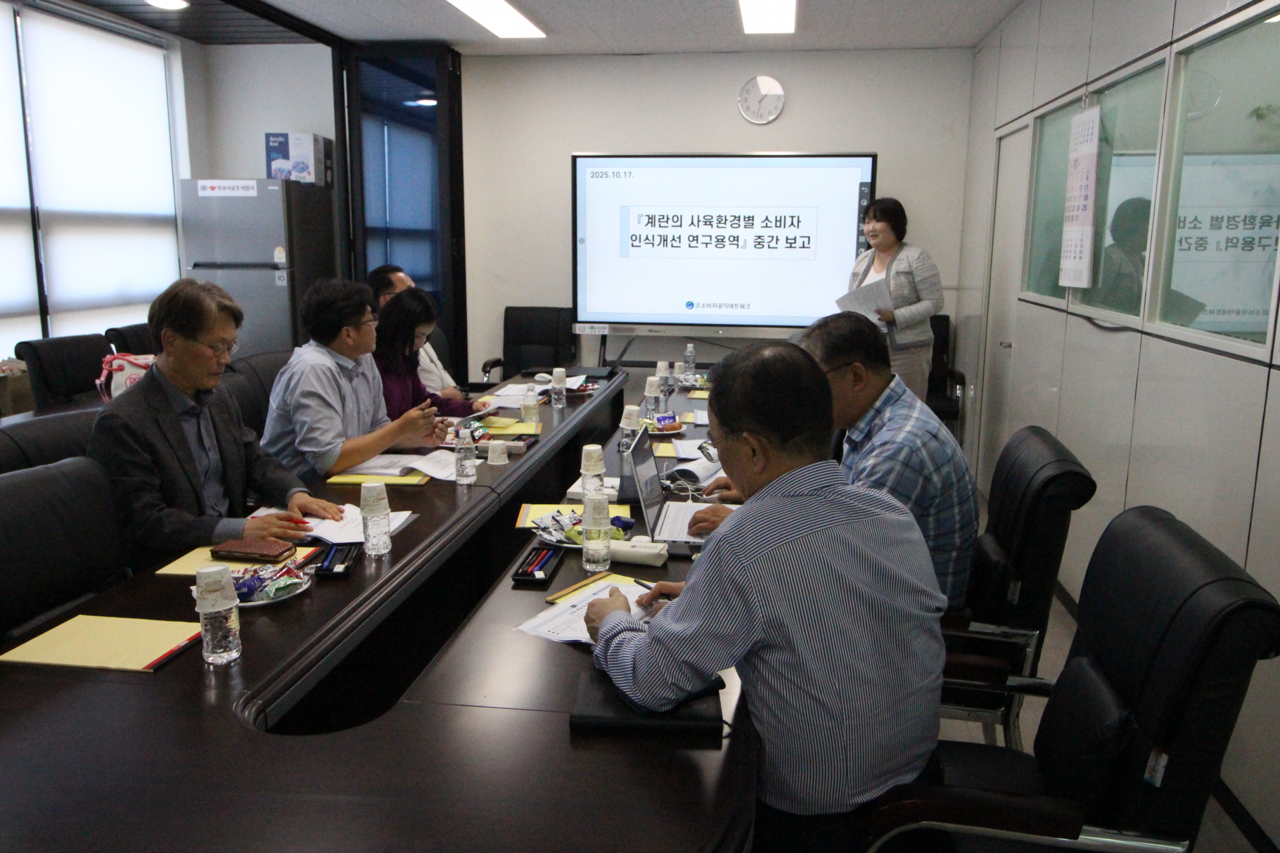 ![]() ![]() ![]() 우리 협회(회장 안두영)는 지난 10월 17일 협회 회의실에서 협회 주관 3개 연구용역과제에 대한 중간보고회를 개최하였다. 주요 연구용역으로는 ①계란의 사육환경별 소비자 인식개선 연구용역(사단법인 소비자공익네트워크) ②산란계 살처분 보상금 평가기준 설정 연구(충남대학교 산학협력단) ③산란계 성계육 및 계분 수출 방안 연구 (경상국립대학교 산학협력단) 과제를 수행중이다. |