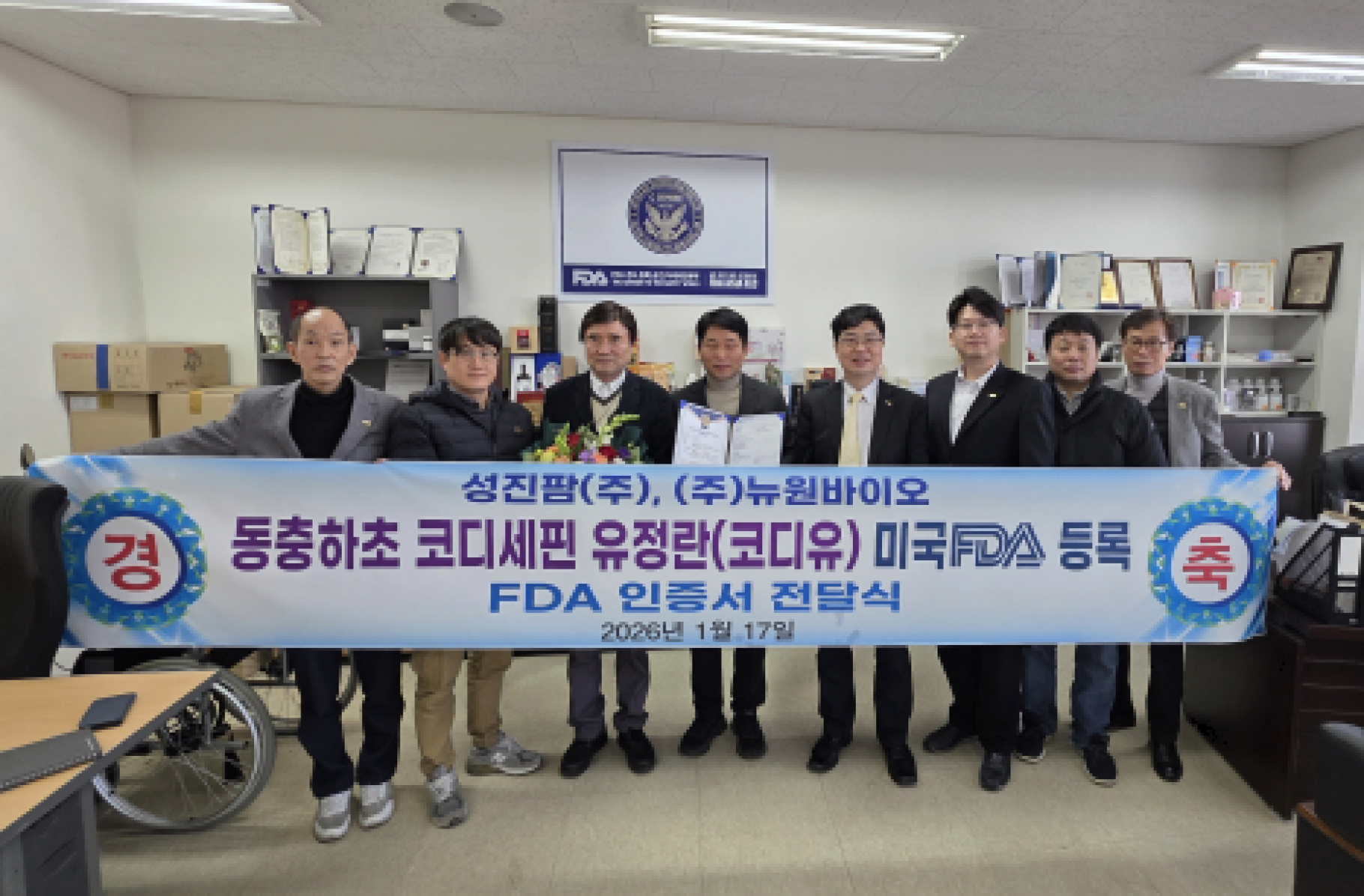 ![]() 경북 칠곡군에 위치한 성진팜(회장 송인환)이 미국 식품의약국(FDA)의 까다로운 심사를 통과한 동충하초 기능성 계란을 개발해 눈길을 끌고 있다. 성진팜은 2024년부터 동충하초와 결합한 기능성 계란 개발에 나서 지난해 제품 개발을 완료했으며, FDA 등록을 신청한 뒤 6개월이 넘는 심사 끝에 최근 충북 오송 소재 FDA ASIA LLC 본사에서 동충하초 '코디세핀' 유정란 '코디유(CoDyU)'의 FDA 등록 인정서를 전달받았다. |