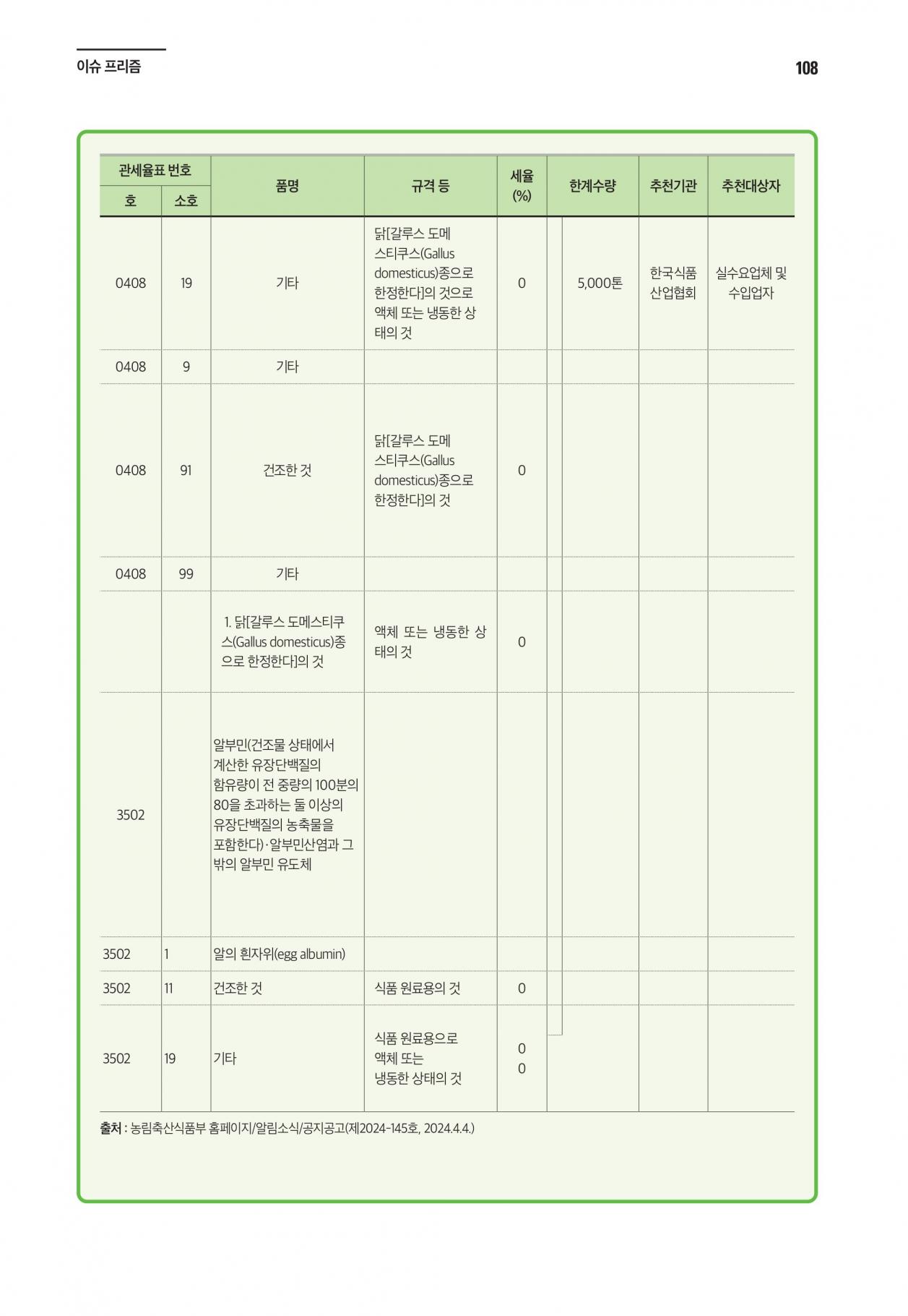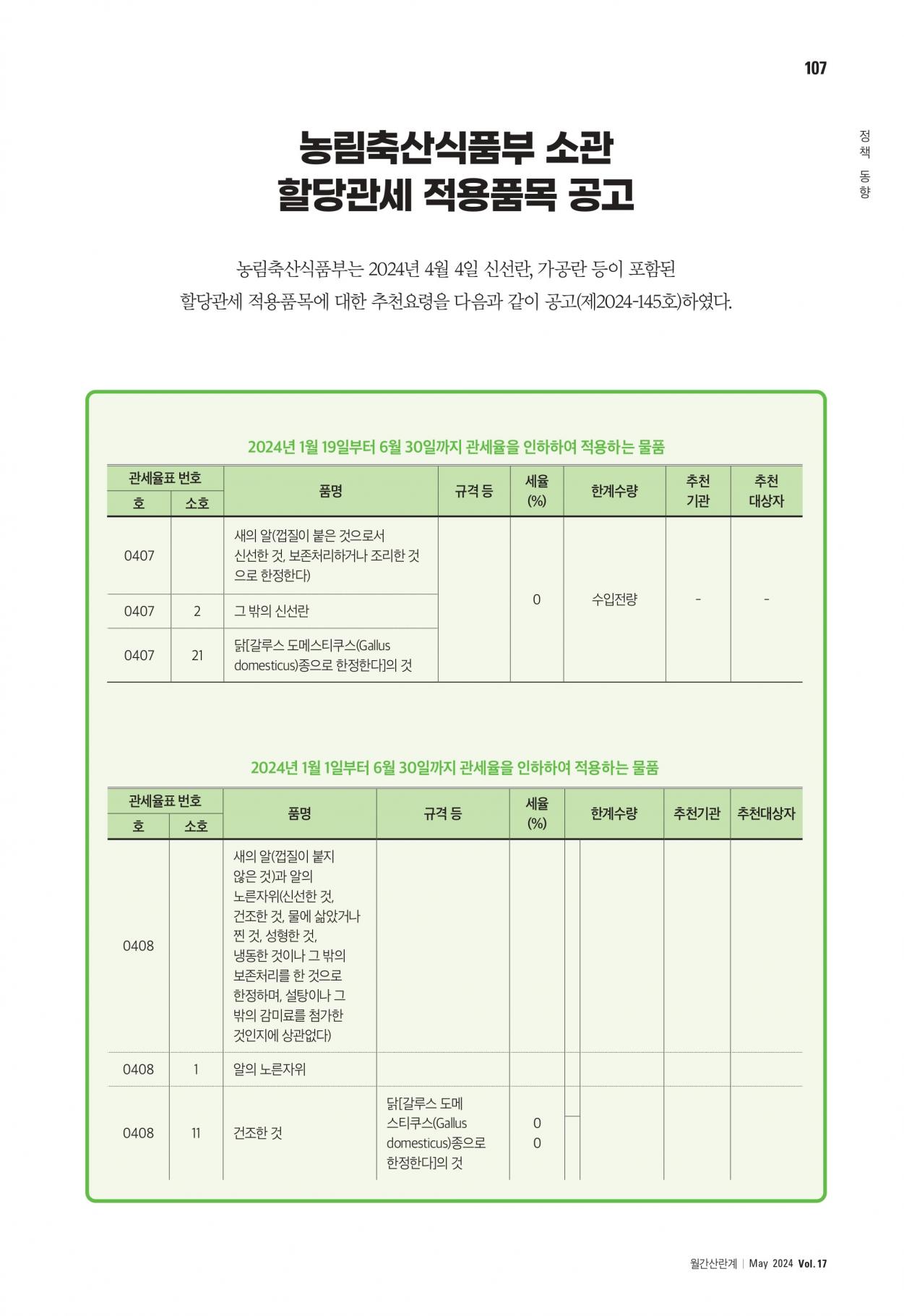 농림축산식품부 소관 할당관세 적용품목 공고