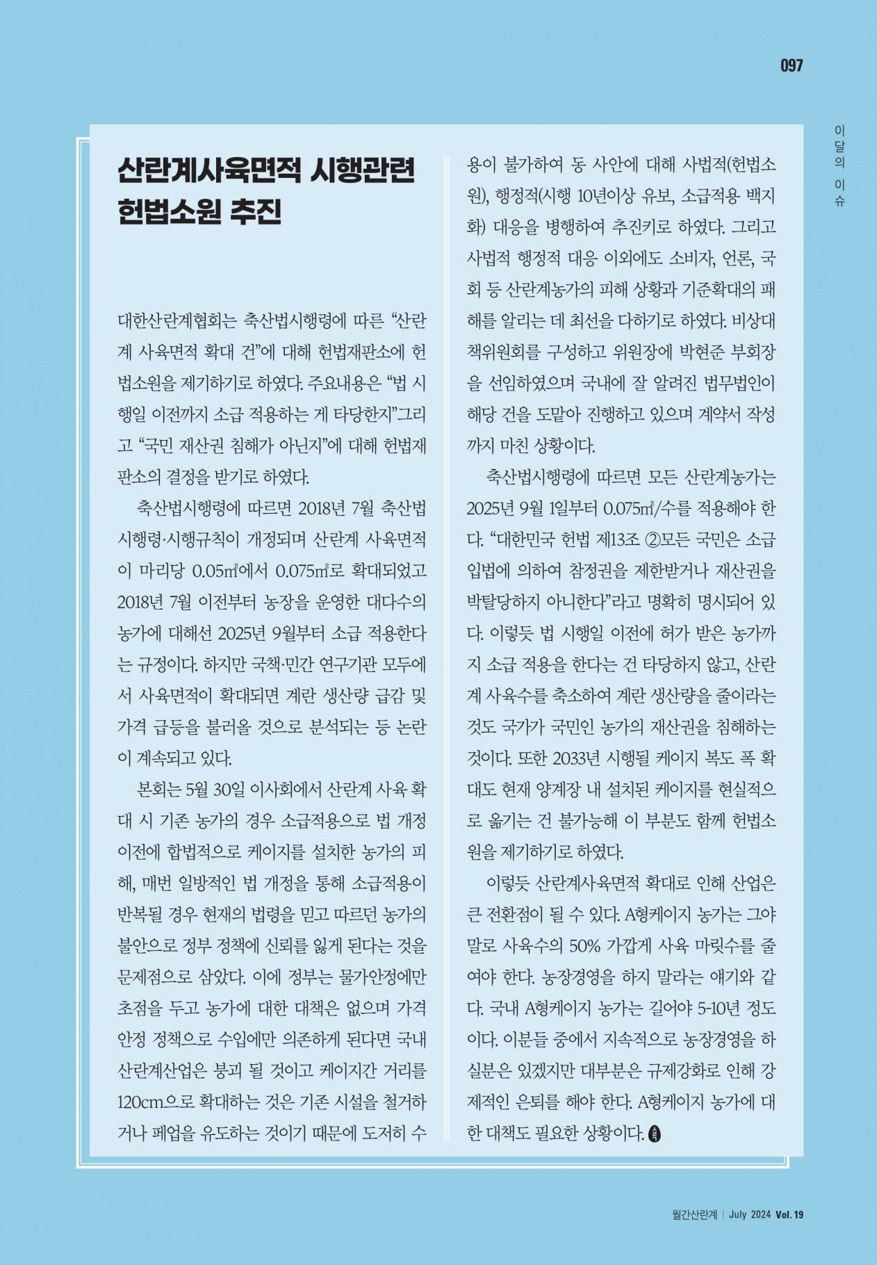 [이달의 이슈] 산란계사육면적 시행관련 헌법소원 추친