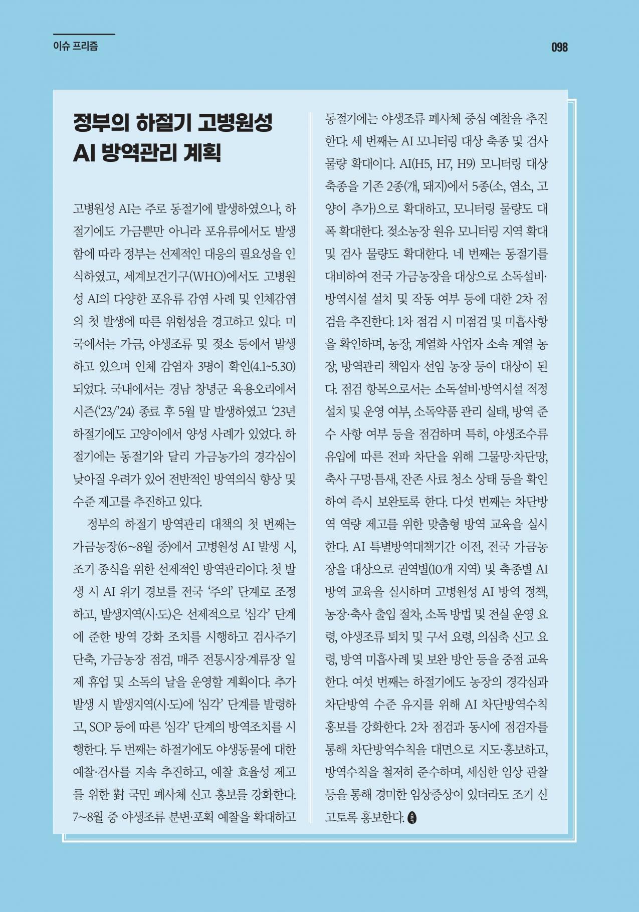 [이달의 이슈] 정부의 하절기 고병원성 AI 방역관리 계획