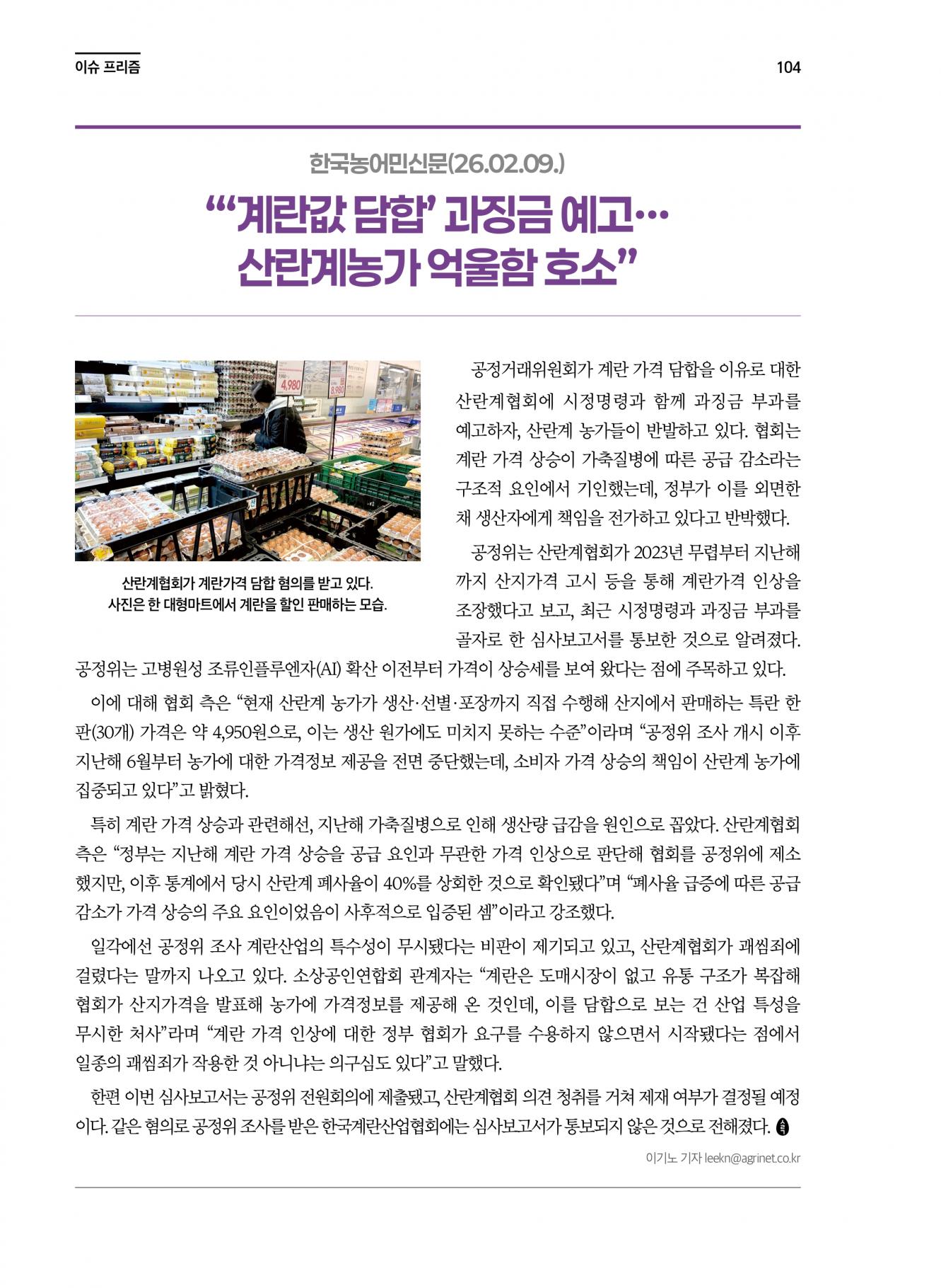 대한산란계협회 홈페이지 회원에게 무차별적으로 보내지는 메일을 차단하기 위해, 본 웹사이트에 게시된 이메일 주소가 전자우편 수집 프로그램이나 그 밖의 기술적 장치를 이용하여 무단으로 수집되는 것을 거부하며, 이를 위반시 정보통신망법에 의해 형사처벌됨을 유념하시기 바랍니다.