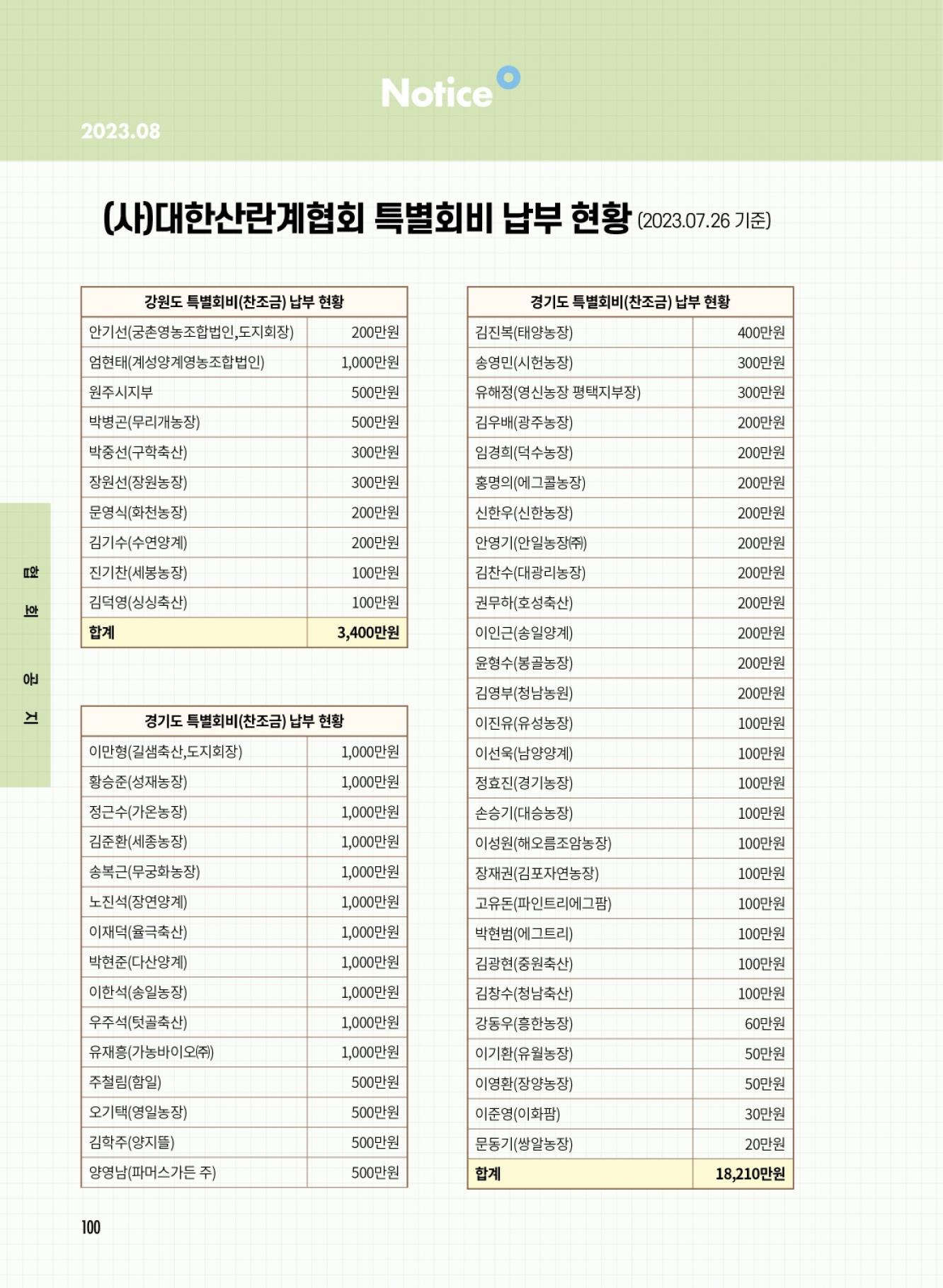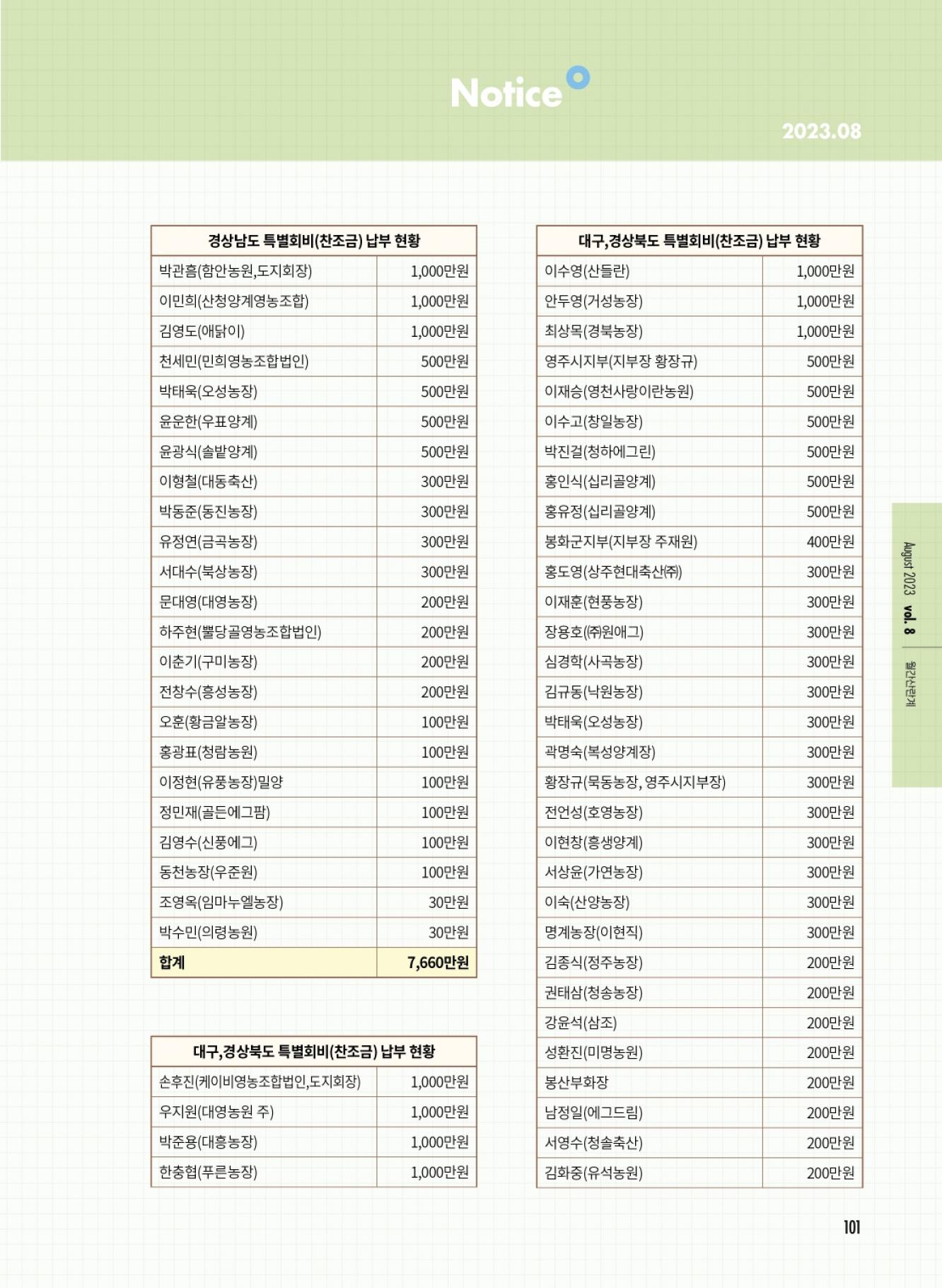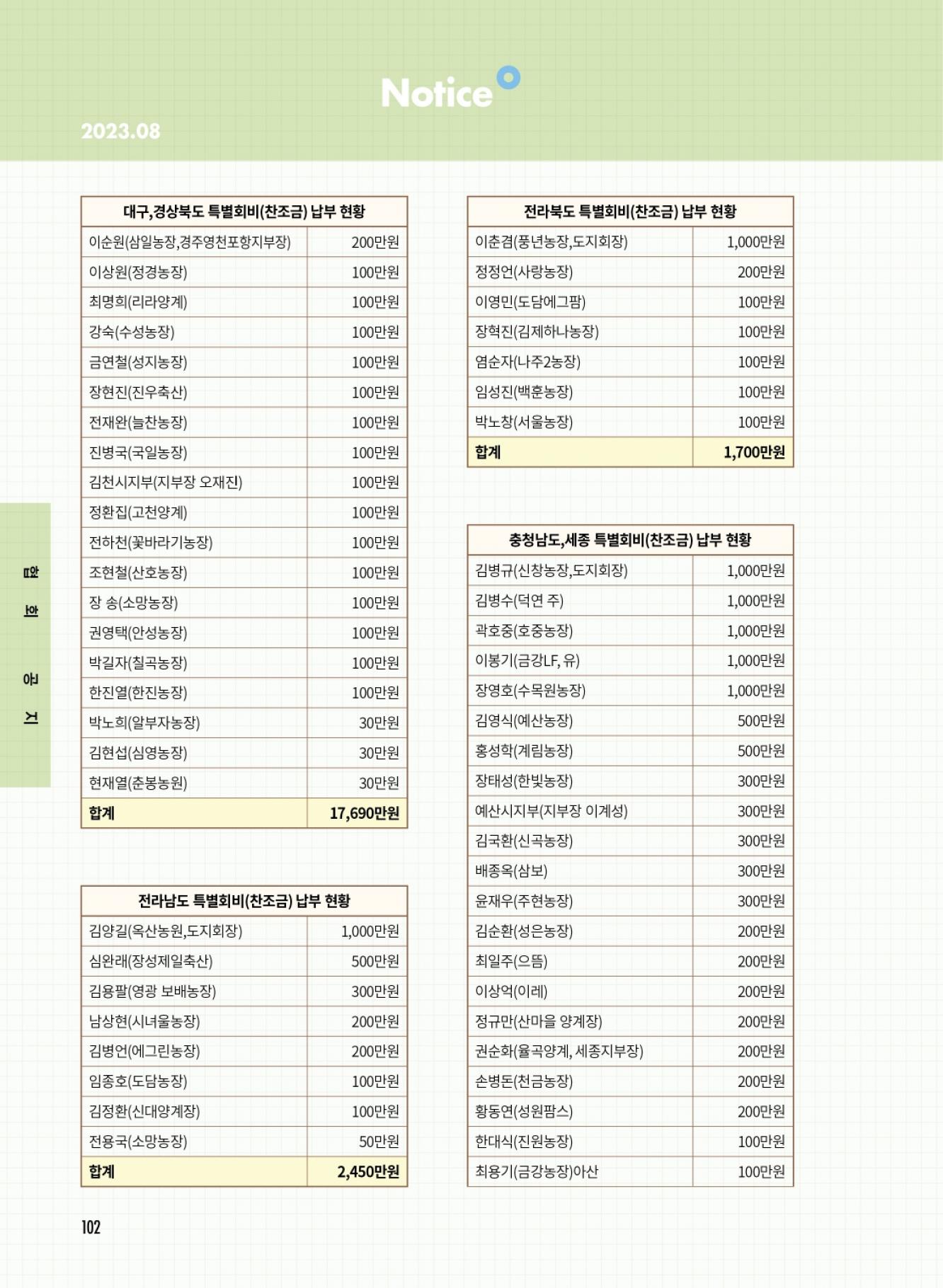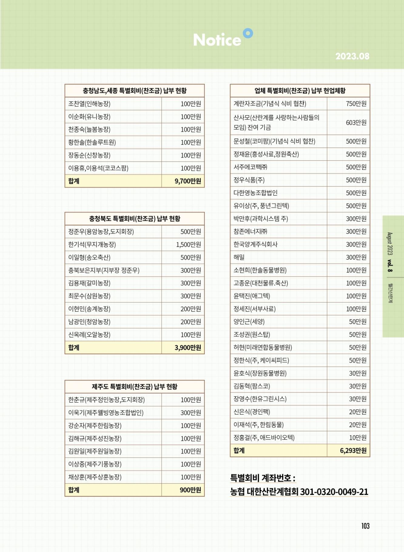 (사)대한산란계협회 특별회비 납부 현황